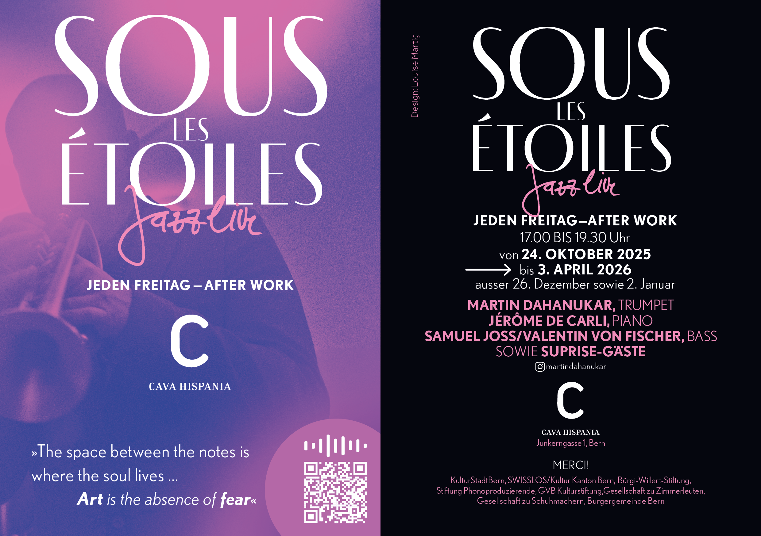 Jeden Freitagabend wird die Cava Hispania nach Büroschluss ab 17:00 im Zeichen von Sous Les Étoiles zum einzigen Ort in Bern für einen easy Apéro zu live Sound mit melodischem, danceable und groovy Jazz, Bossa Nova & beyond. Mit Martin Dahanukar (trumpet), Jérôme de Carli (piano), Valentin von Fischer oder Sam Joss (bass) sowie Surprise-Gästen.